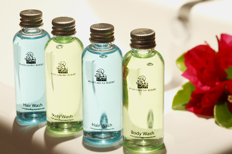 Particularly tall travellers must duck beneath the arch of reeds which rises from either side of the bridge, forming a canopied tunnel festooned with tiny purple flowers. This use of running water for architectural purposes, which continues throughout the Peace Laguna resort, is restfull on the senses.