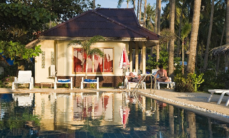 The bungalows’ balconies are on the small side, but are perfectly adequate for a shorter stay. They have air-con, attractive views of mature palm trees and are only a few metres from the beach.