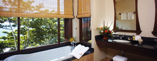 Some of the Deluxe rooms have the bath set into an alcove off the bedroom, while in others the bath shares a room with the WC and shower. Most people like the former design better, and it lends itself to more spontaneous romantic possibilities for people on honeymoon, whether it's their first honeymoon, their second honeymoon, or their thirty-third honeymoon. Wherever the bath is located, all the Deluxe rooms exhibit the faultless taste for which Pimalia is a byword on Lanta and further afield.